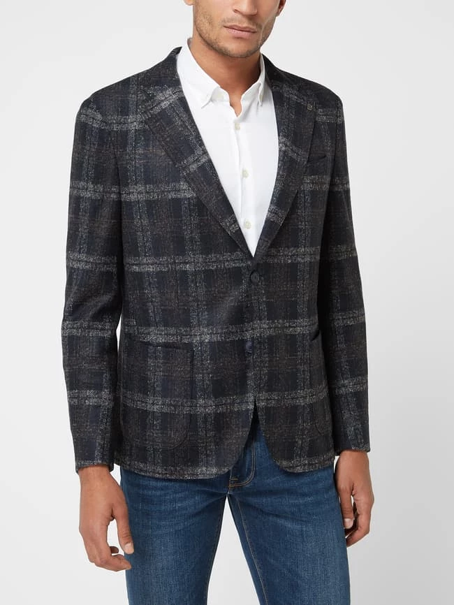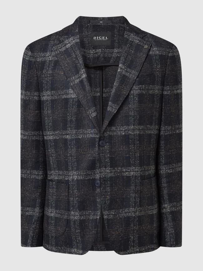 Das 2-Knopf-Sakko von DIGEL ist aus einer Materialmischung mit Woll-Anteil gefertigt. Es zeigt sich im Slim Fit mit Karomuster, fallendem Revers und Kissing Buttons.