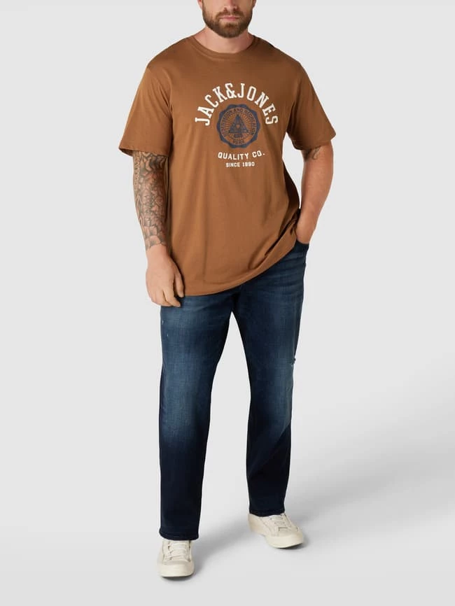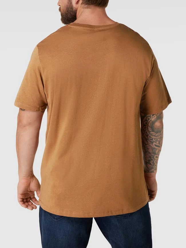 Das T-Shirt von JACK & JONES Plus ist aus reiner Baumwolle gefertigt und gerade geschnitten. Es zeigt sich im unifarbenen Design mit Label-Print und geripptem Rundhalsausschnitt.