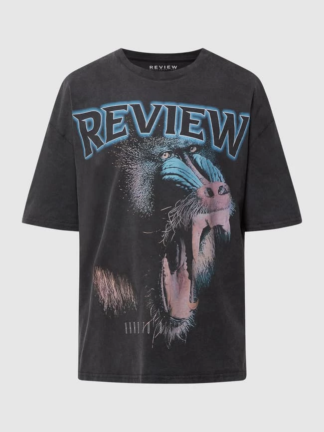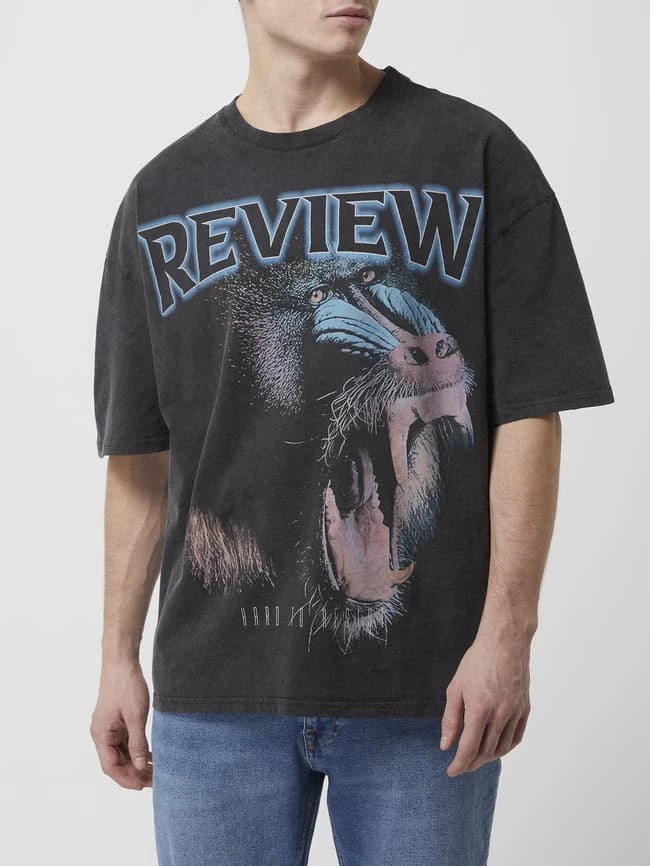 Das T-Shirt von REVIEW ist aus reiner Baumwolle gefertigt und locker geschnitten. Es kommt im Washed-Out-Look mit überschnittenen Schultern und Animal-Print.