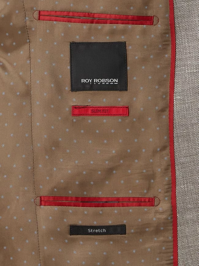 Das Sakko von ROY ROBSON ist aus einer Leinenmischung mit Schurwoll- und Stretch-Anteil gefertigt. Es kommt im Slim Fit mit fallendem Revers und Pattentaschen.