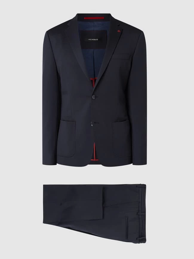 Der Anzug von ROY ROBSON ist aus einer Materialmischung mit Viskose- und Stretch-Anteil gefertigt. Er kommt im Slim Fit mit fallendem Revers, aufgesetzten Taschen und Hose mit Tunnelzug.